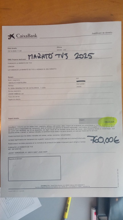 L’Escòla d’Ostalaria de Les va participar a La Marató de TV3 amb diverses activitats solidàries. Els alumnes de Pastisseria, Gestió d’Allotjaments Turístics i el PTT de Comerç i Venda van elaborar torrons i altres productes nadalencs que es van posar a la venda en una parada solidària. A més, es va organitzar un esmorzar solidari al Lòla Bar. Una jornada que va combinar l’esforç i la creativitat de l’alumnat amb la solidaritat per una causa significativa.